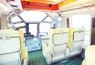 最前頭的車廂,是前面配置大大的玻璃窗、視野極佳的雙層挑高設計車廂。您可以奢侈地享受眼前風光。入口付近設有置物櫃,座位不會因為行李而變得狹窄。