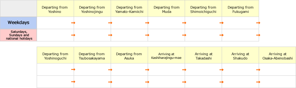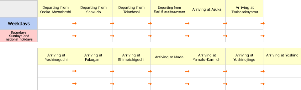 Osaka-Abenobashi, Shakudo, Takadashi, Kashiharajingu-mae, Asuka, Tsubosakayama, Yoshinoguchi, Fukugami, Shimoichiguchi, Muda, Yamato-Kamiichi, Yoshinojingu and Yoshino