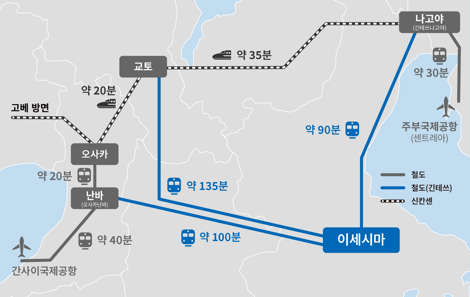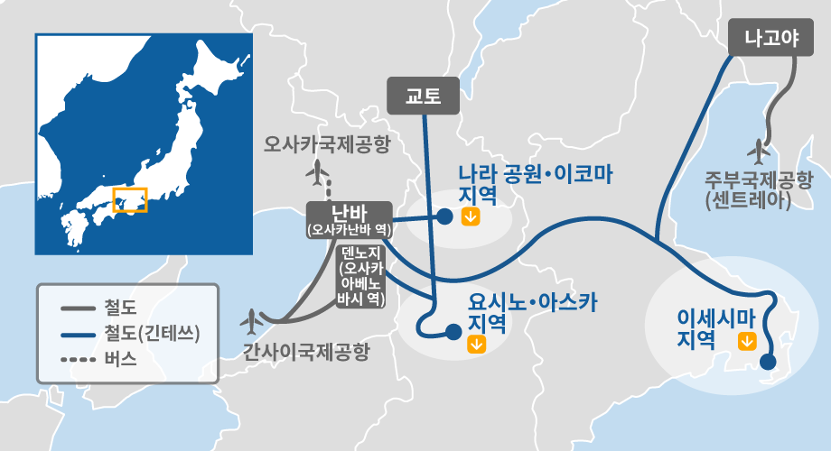 오사카, 나라, 교토, 나고야, 미에(이세시마)로 가는 저렴하고 편리한 디지털 티켓입니다.