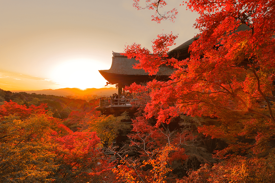 유네스코 세계유산에도 등록되어 있는, 교토를 대표하는 기요미즈데라는 약 1200년의 역사를 자랑합니다. 볼거리는 수도 없이 많지만, 무엇보다도 거대한 목조 무대가 유명합니다. 13미터 높이에서 내려다 보이는 나무들은 절경입니다. 특히 가을철에 방문하면, 일몰 후에 라이트업 된 단풍이 그야말로 환상적인 광경입니다.