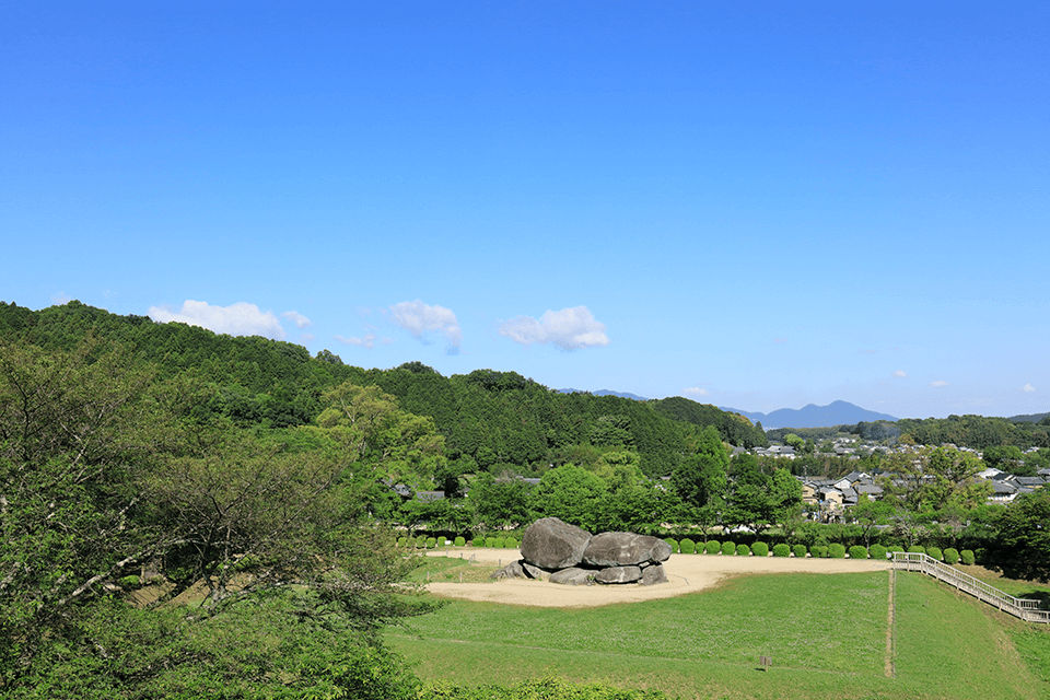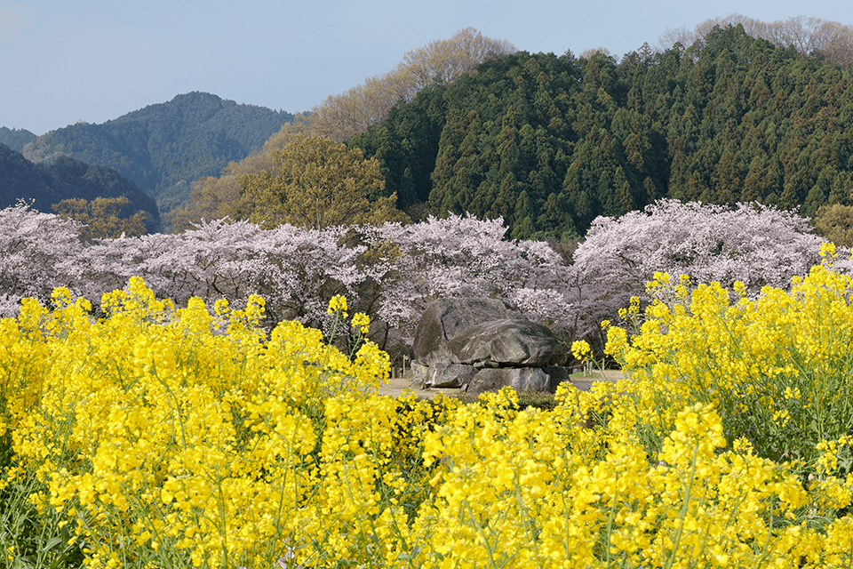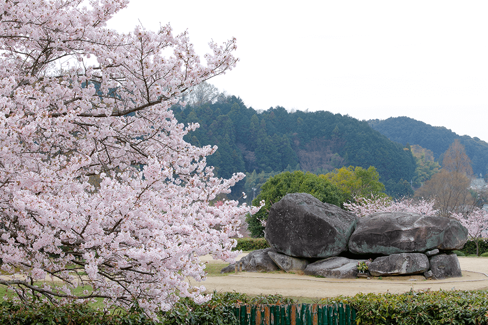마치 거대한 바위로 둘러싸인 무대처럼 보이는 이 돌로 된 고분은 아스카 시대에 불교를 보급시킨 위인인 소가노 우마코의 묘라고 전해지고 있습니다. 어느 계절에 찾아도 광경은 훌륭하지만 밤 벚꽃 일루미네이션을 배경으로 라이브 음악 공연 등이 개최되는 봄에 더욱 가고 싶은 매력적인 관광지입니다.