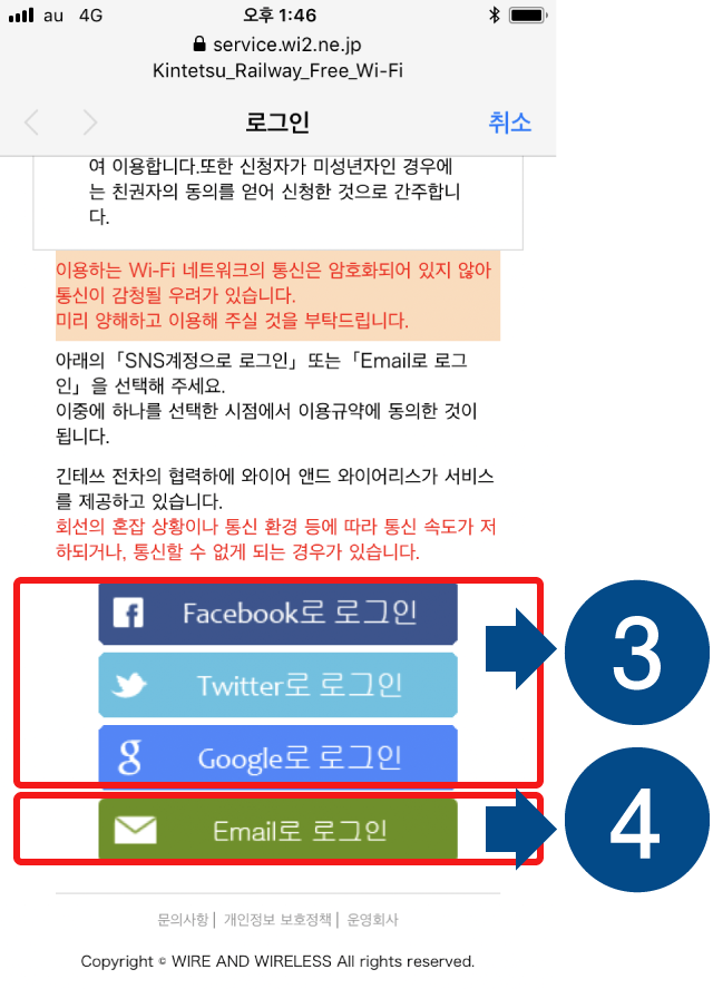 “Wi-Fi”를 ON으로 바꾼 후 목록으로부터 “Kintetsu_Railway_Free_Wi-Fi” 또는 “Kintetsu_Railway_Free_Wi-Fi2”를 선택합니다.