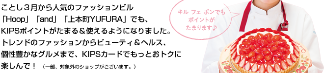 ことし3月から人気のファッションビル「Hoop」「and」「上本町YUFURA」でも、KIPSポイントがたまる&使えるようになりました。トレンドのファッションからビューティ&ヘルス、個性豊かなグルメまで、KIPSカードでもっとおトクに楽しんで! (一部、対象外のショップがございます。)
