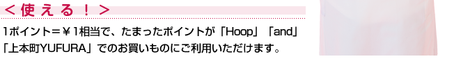 [使える!]1ポイント=¥1相当で、たまったポイントが「Hoop」「and」「上本町YUFURA」でのお買いものにご利用いただけます。