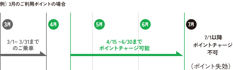 ポイントチャージはご乗車の翌月15日から可能となり、付与月当月を含み3カ月後の末日が有効期限となりますので、有効期限までにチャージのご操作をお願いします