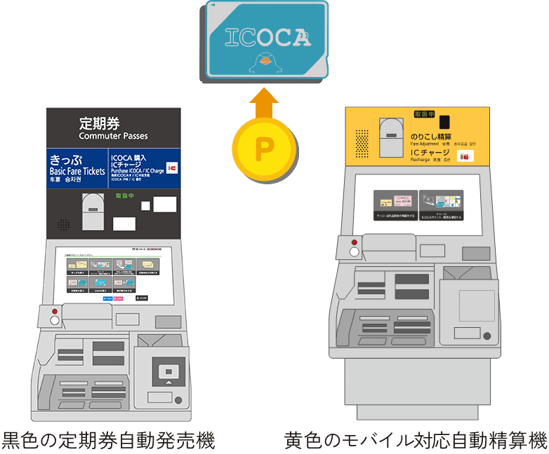 ポイントチャージ黒色の定期券自動発売機(定期券発売駅に設置)または黄色のモバイル対応自動精算機を使って