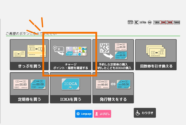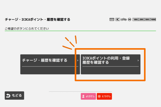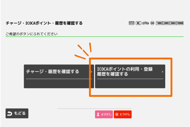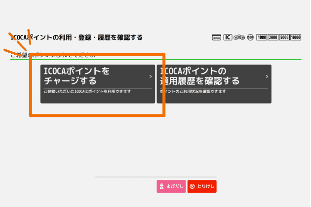「ICOCAポイントの利用・登録/履歴を確認する」(黄色のモバイル対応自動精算機は「 ICOCA ポイントでチャージ」)を選択
