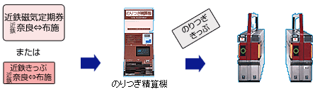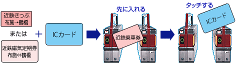 近鉄の乗車券を先に自動改札機に入れ、その後、ICカードをタッチしてください。 回数券カードで乗り継がれる場合も、近鉄の乗車券を先に自動改札機に入れ、その後、ICカードをタッチしてください。
