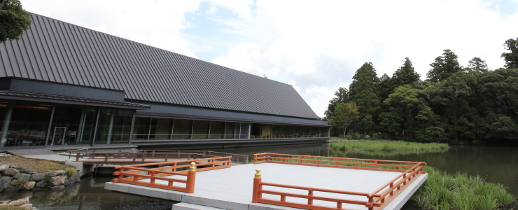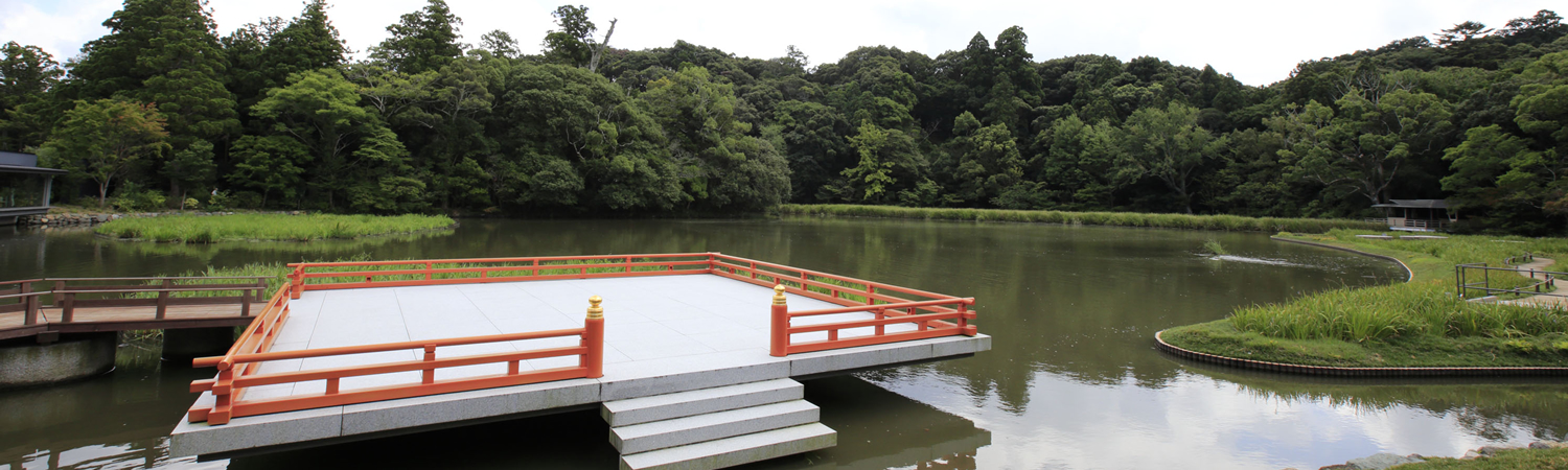 池の西側には菖蒲園(しょうぶえん)が広がり、北側の池畔にある舞楽の舞台では神宮観月会が行われます。