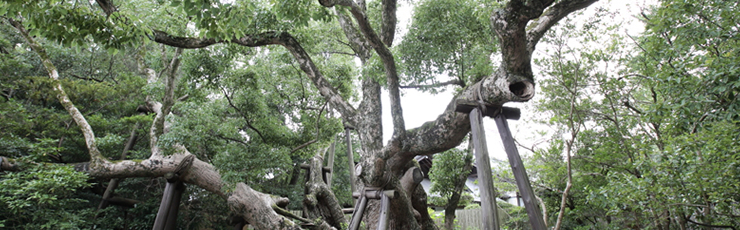 樹齢1000年近くある大楠。平清盛が参宮したとき枝が冠にふれたため、枝を切らせたという伝説があります。
