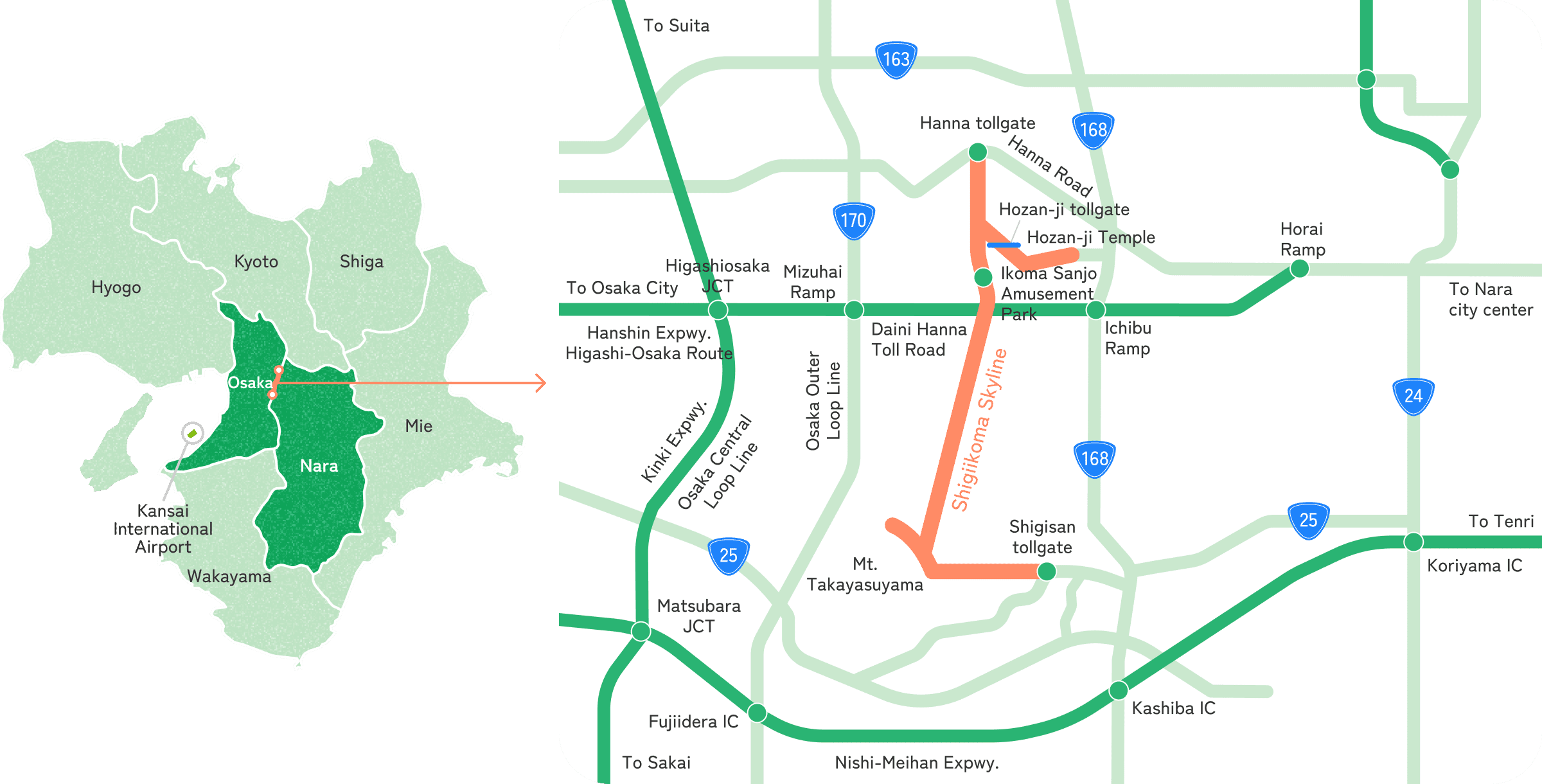 It takes approximately 25 to 30 minutes from Nara City and approximately 30 minutes from Osaka City using the expressway.