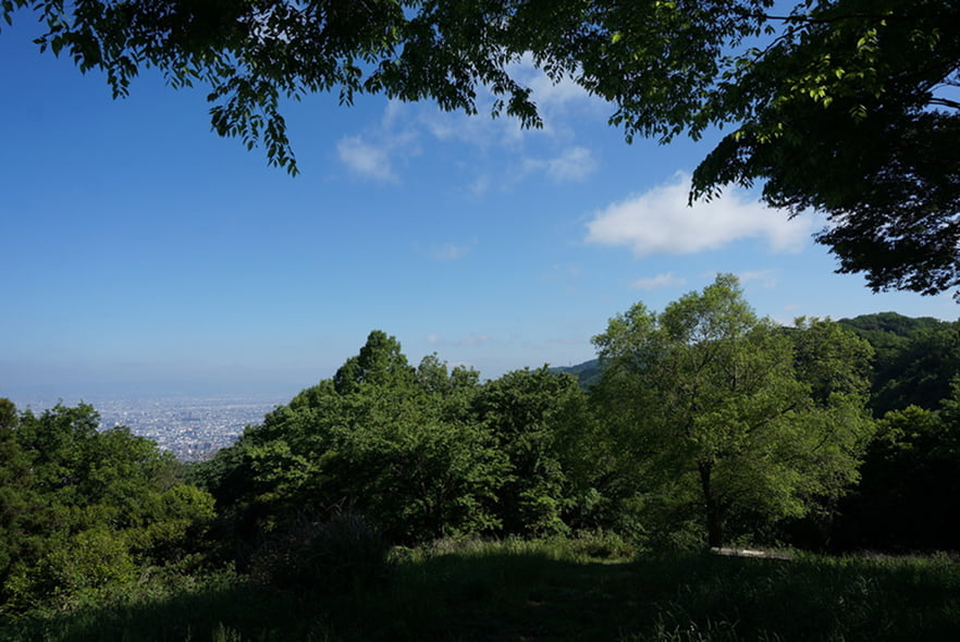 17ha(ヘクタール)の小さな園地ですが、芝生展望広場や峠の駐車場からは大阪市街の景色を楽しむことができます。また、近くには弘法大師ゆかりの水呑地蔵や伊勢物語にも登場する業平街道、十三峠などの史跡があります。