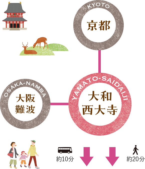 広大な敷地に、政治や儀式を執り行った大極殿、平城宮の正門である朱雀門、日本庭園の原型ともいわれる東院庭園等が復元されています。平城宮いざない館では、奈良時代の平城宮を体感し、出⼟品や資料を読み解くことによって、平城宮跡の魅⼒をより深く理解することができます。