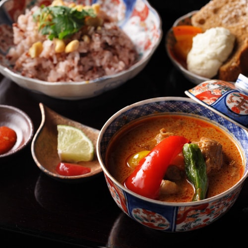 江戸時代末期に建立された、旧興福寺子院[世尊院]を改修した茶寮。オリジナルブレンドのスパイスを使用したレッドチキンカレーは、奈良県産の柑橘・大和橘を加えて爽やかな味わいに。別添えの南高梅やライム、一味唐辛子の柚子胡椒で、味の変化も楽しんで。世世のスパイス4,807円(サ込)