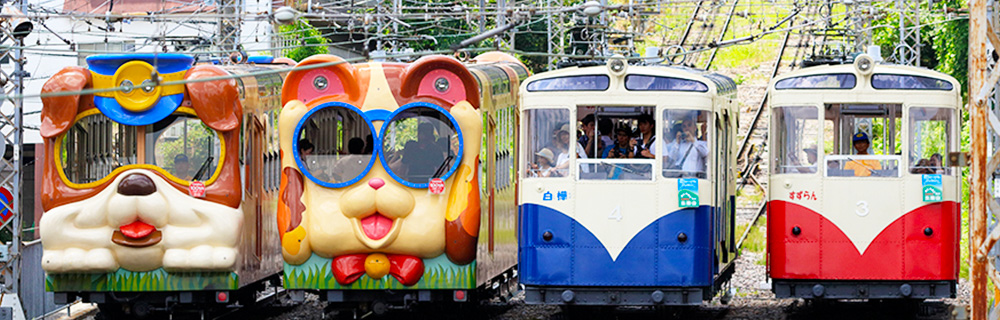 宝山寺線は犬と猫をモチーフにした「ブル」号と「ミケ」号(別の車両で運転する日があります)、山上線はピアノをかたどった「ドレミ」号とケーキをかたどった「スイート」号で運転。