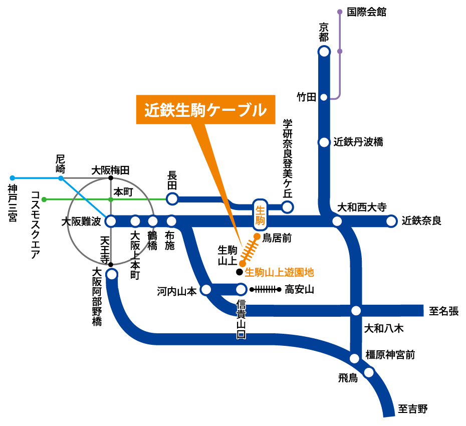 生駒ケーブルは、鳥居前駅と宝山寺駅を結ぶ宝山寺線と、宝山寺駅と生駒山上駅を結ぶ山上線からなります。