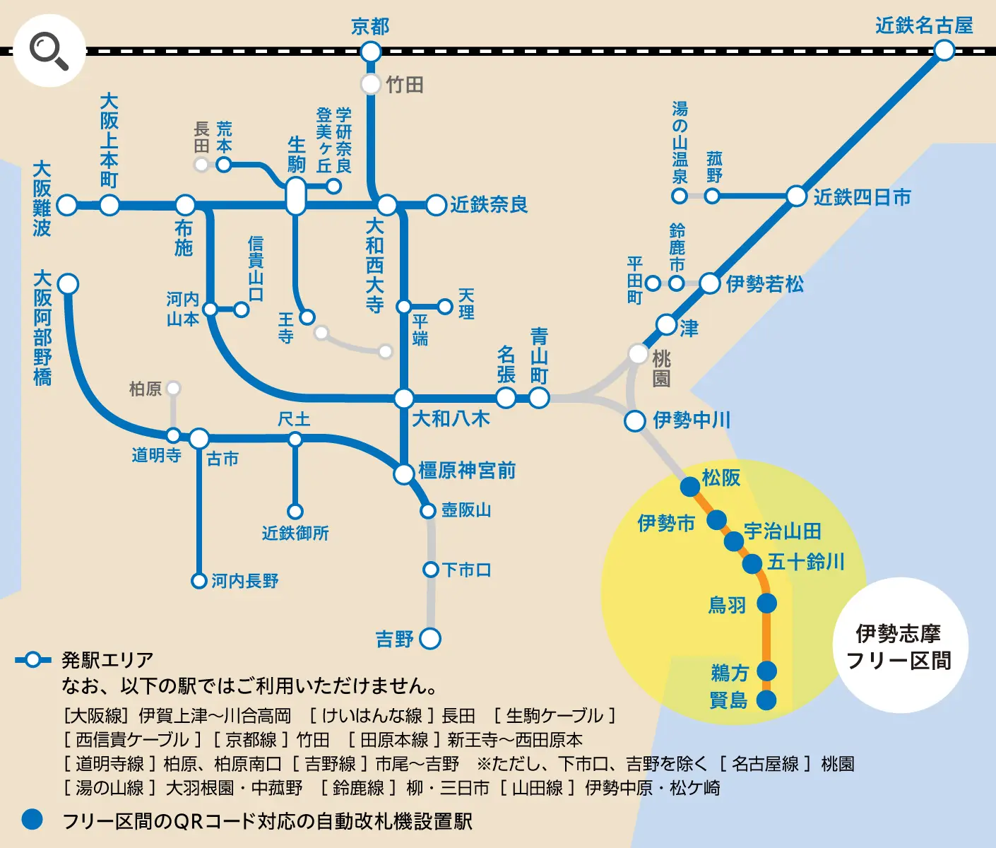 ●また、発駅(または着駅)が今里駅~菖蒲池駅、荒本駅~学研奈良登美ヶ丘駅、菜畑駅~王寺駅となるものは、奈良線から大阪線および大阪線から奈良線への乗り継ぎによる鶴橋~布施間の乗車も可とします。
