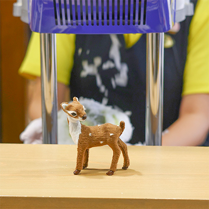 芝生の緑は、宇治抹茶シロップ・ピスタチオシロップで表現されており、山の頂上にはこの店自慢のフィアンティーヌでかたどった子鹿さんが。