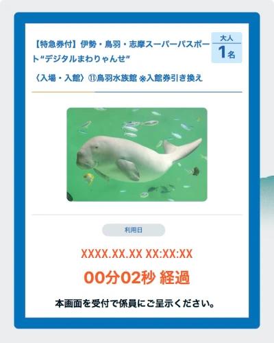 伊勢・鳥羽・志摩スーパーパスポート“まわりゃんせ”〈特典利用施設〉のステッカーが掲示されている店舗で、「呈示特典施設利用券」画面を表示して、係員にご呈示ください。