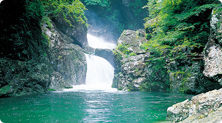 みずみずしい緑に包まれる美しい渓谷。エメラルドグリーンに輝く清流沿いには遊歩道が整備されており、つり橋からは大小さまざまな滝と、神秘的な巨岩群を見下ろすことができます。